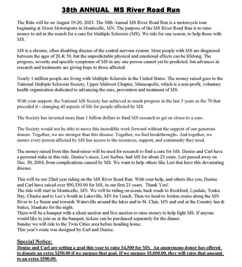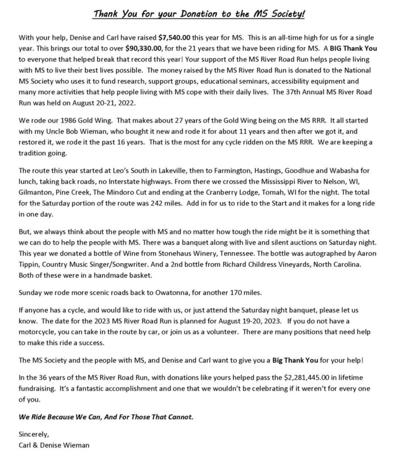 Suggestions: Check with your local printer, to see if they will give a discount or free printing. Owatonna InstyPrints has provided us with many years of free printing. Print enough letters for mailing to everyone on your list, as well as many more to hand out to other people, especially the people that ask you for donations for their fund raising program. Attend Cycle meetings or a group get together and hand out letters. Buy postage stamps and keep the receipt for tax purposes. Unfortunately US Postal will not donate stamps. Maybe your work place will allow you to use their postage machine if they have a machine.